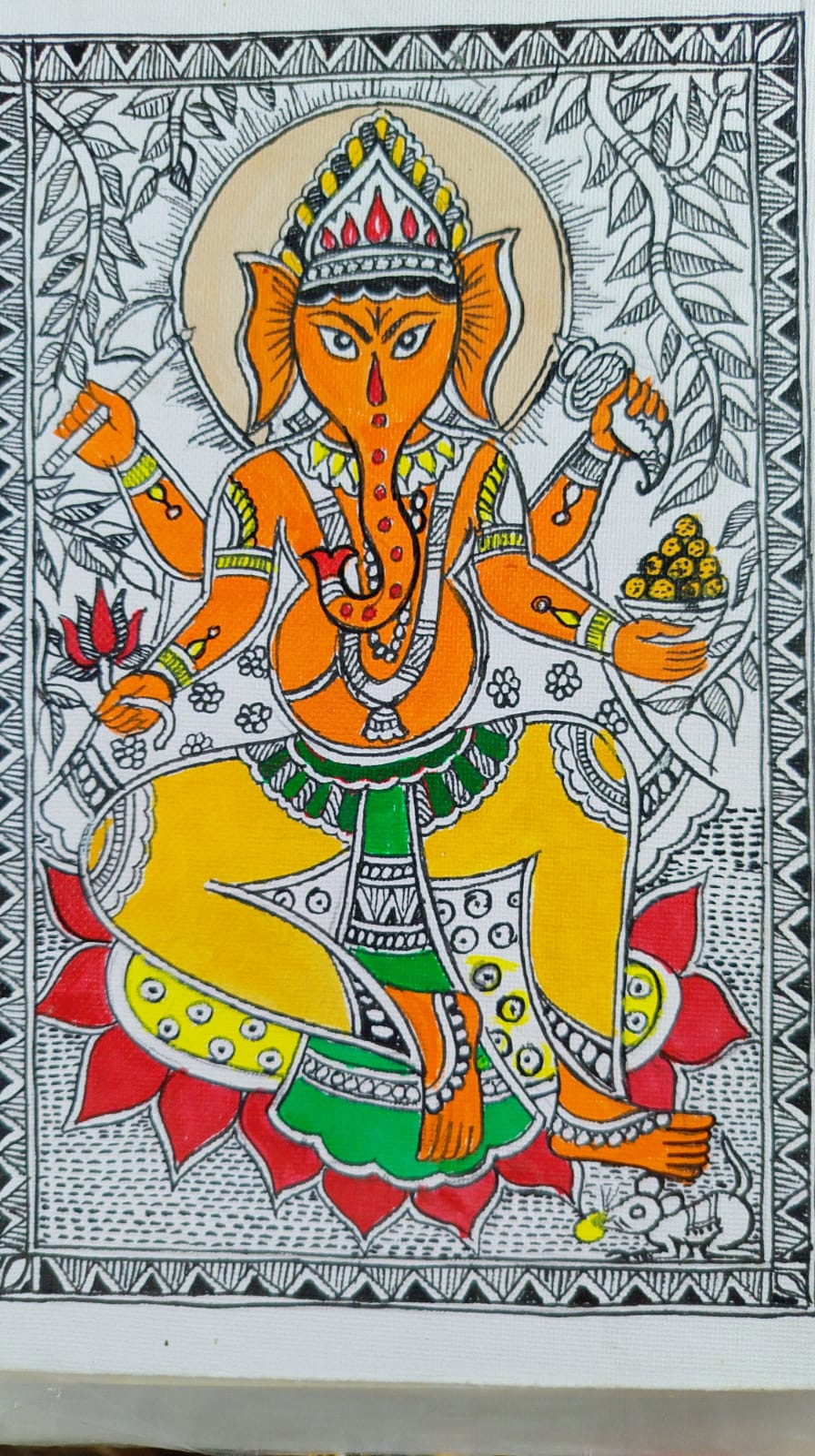 Madhubani art Ganesha painting on canvas is handcrafted using natural dyes and vibrant colors. Depicting Lord Ganesha in traditional folk style, it symbolizes wisdom, prosperity, and good fortune. The intricate patterns, cultural essence, and eco-friendly materials make it a unique, spiritual, and decorative masterpiece.